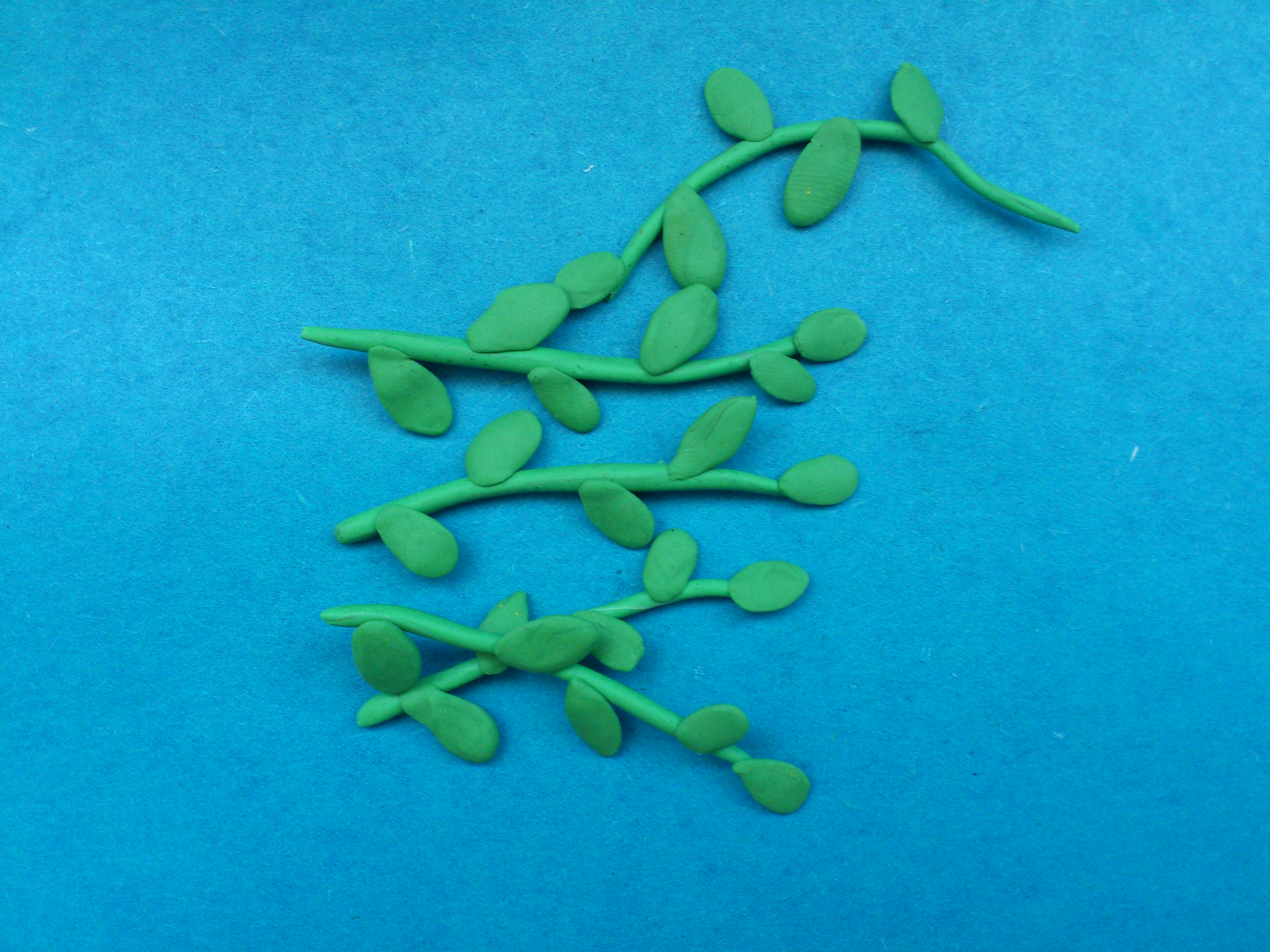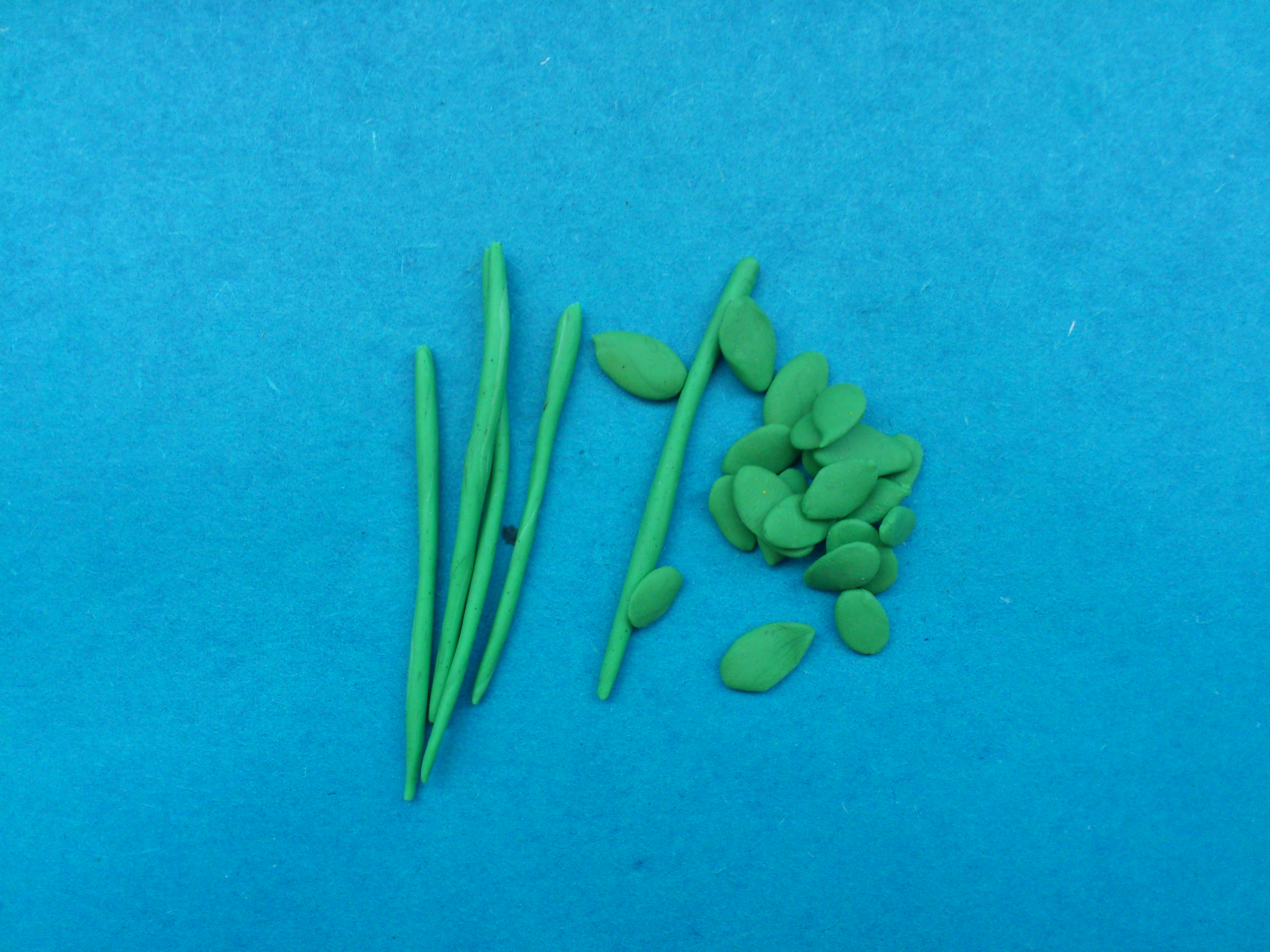 3. Для создания красивого комнатного растения слепите из пластилина несколько длинных зеленых колбасок и несколько плоских листиков.